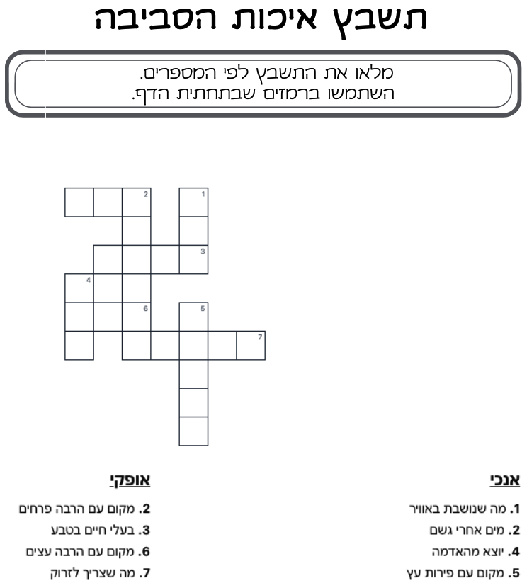 תשבץ איכות הסביבה עוזר לילדים להבין מושגים חשובים כמו מיחזור, מים, ניקיון ושמירה על הטבע, דרך משחק פשוט ונגיש. במקום הרצאות או הסברים ארוכים, הילדים לומדים דרך פתרון מילים שמחוברות לחיים שלהם. הרמזים ברורים, המילים מוכרות, והחוויה מעודדת חשיבה ואחריות אישית. התשבץ מתאים לפעילות כיתתית, לשיעורי חברה או לפעילות משפחתית שמעוררת שיח.